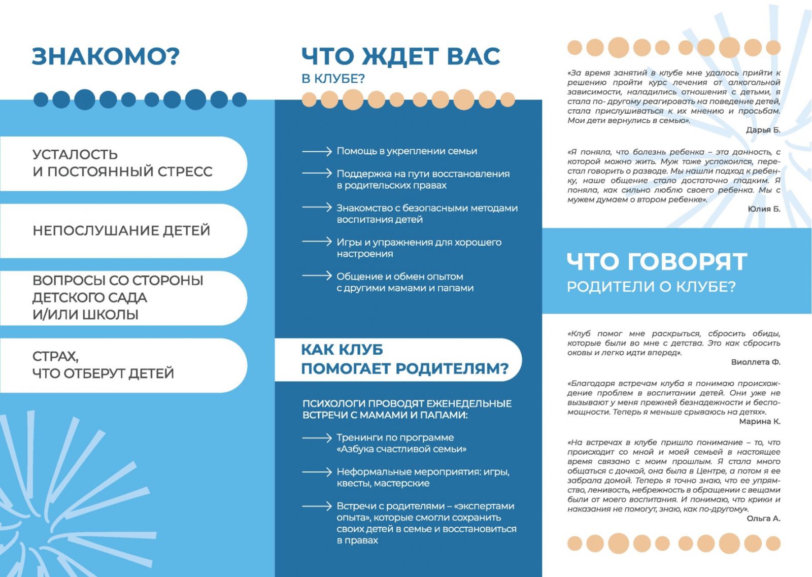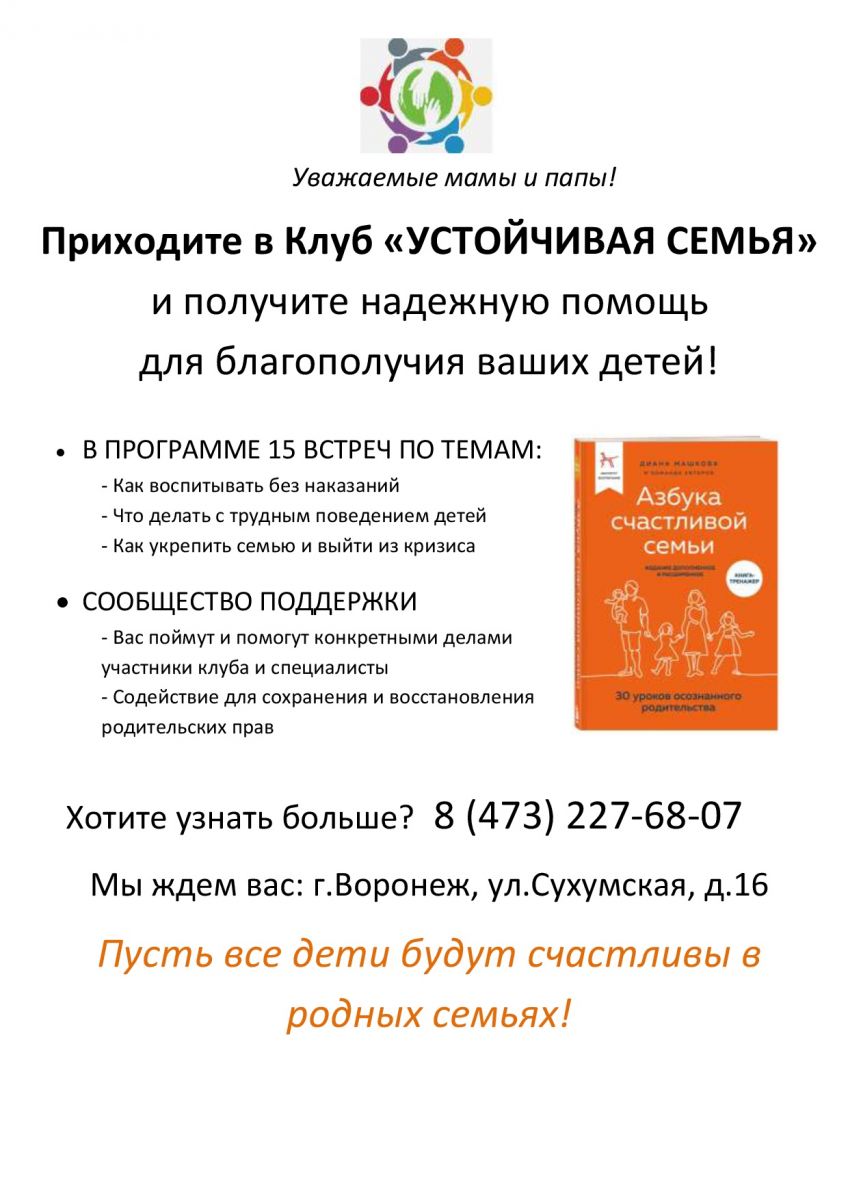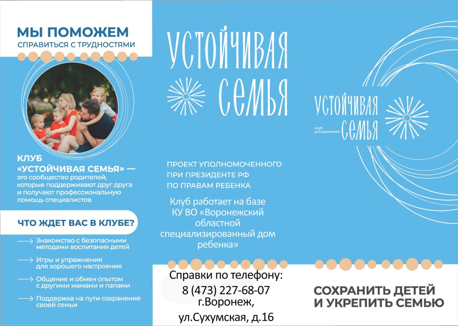 «На базе учреждения, в рамках работы службы «Дети в семье», функционирует клуб «Устойчивая семья», который помогает созданию прочных отношений на ранних этапах развития между родителями и детьми от 0-4 лет. Для занятий в клубе приглашаются родители, имеющие детей от 0-4 лет»