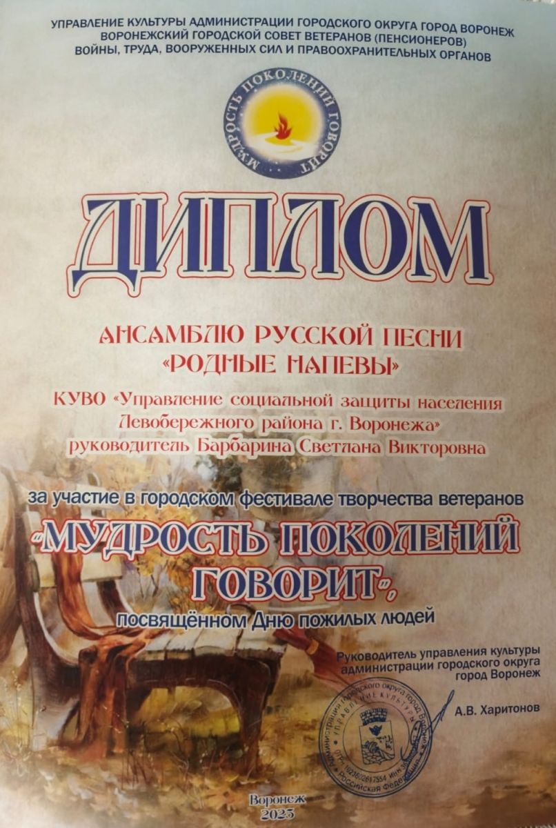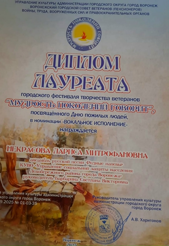 21.09.2025 г. Ансамбль русской песни «Родные напевы» посетители программы «Активное долголетие» КУВО "УСЗН Левобережного района г. Воронежа" принял участие в городском фестивале творчества ветеранов «Мудрость поколений говорит», посвященном Дню пожилых людей. Выступали в двух номинациях: ансамбль и вокальное исполнение (солист). В исполнении ансамбля прозвучала песня «Сердце земли моей». Вокалистка ансамбля Некрасова Лариса Митрофановна исполнила песню «У природы нет плохой погоды» и была награждена дипломом Лауреата городского фестиваля творчества ветеранов «Мудрость поколений говорит».